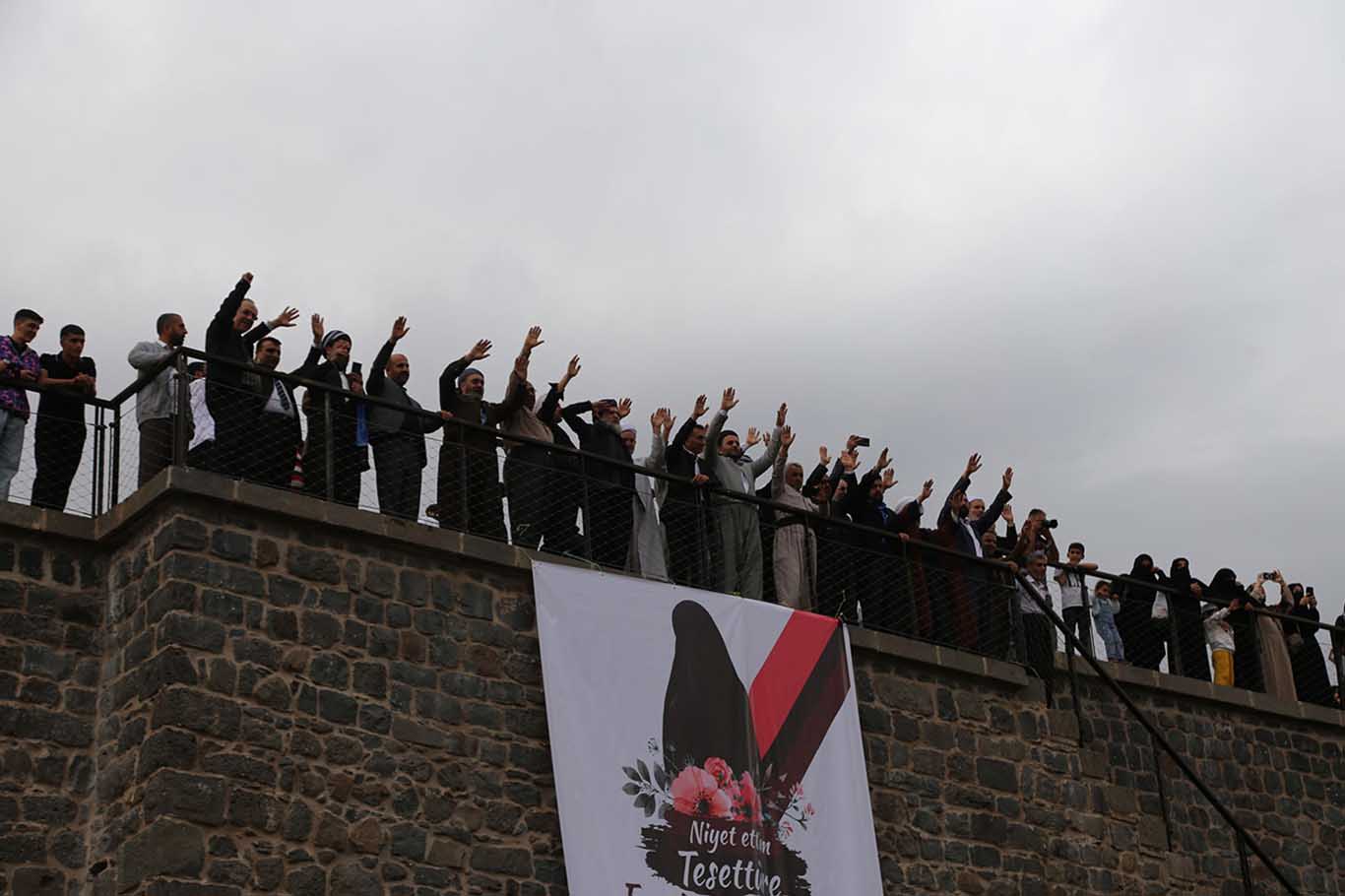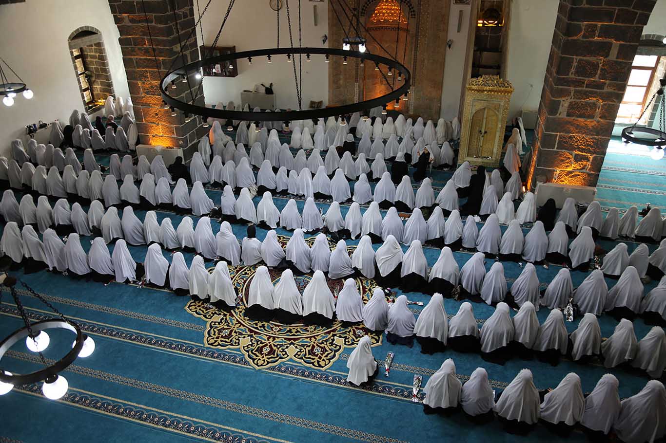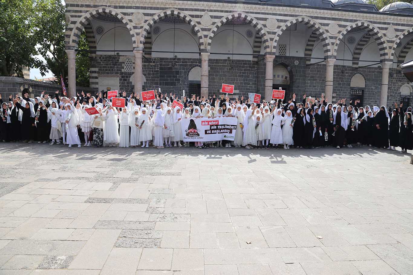 Diyarbakır merkez Sur ilçesi Kurşunlu Camii’nde namaz kılan katılımcılar, ardından Hazreti Süleyman Camii Yerleşkesi’ne doğru yürüyerek burada kendileri için hazırlanan alanda yerlerini aldı.