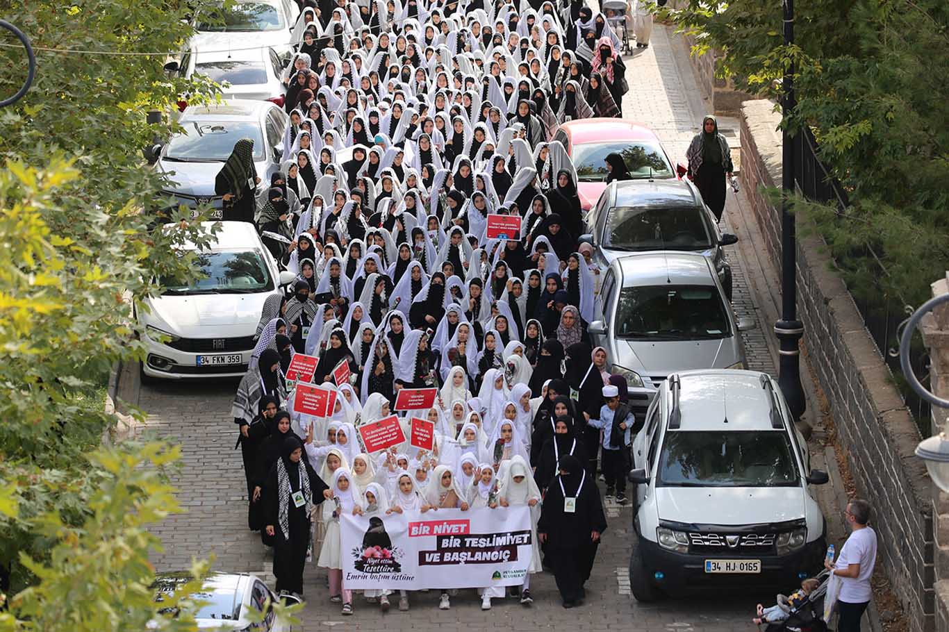 Tesettüre bürünen kız çocukları ve gençlerin ailelerinin de yoğun katılım ve teveccüh gösterdiği program, Kur’an-ı Kerim tilavetiyle başladı, ardından Şeyma Kaplan’ın selamlama konuşmasıyla devam etti.